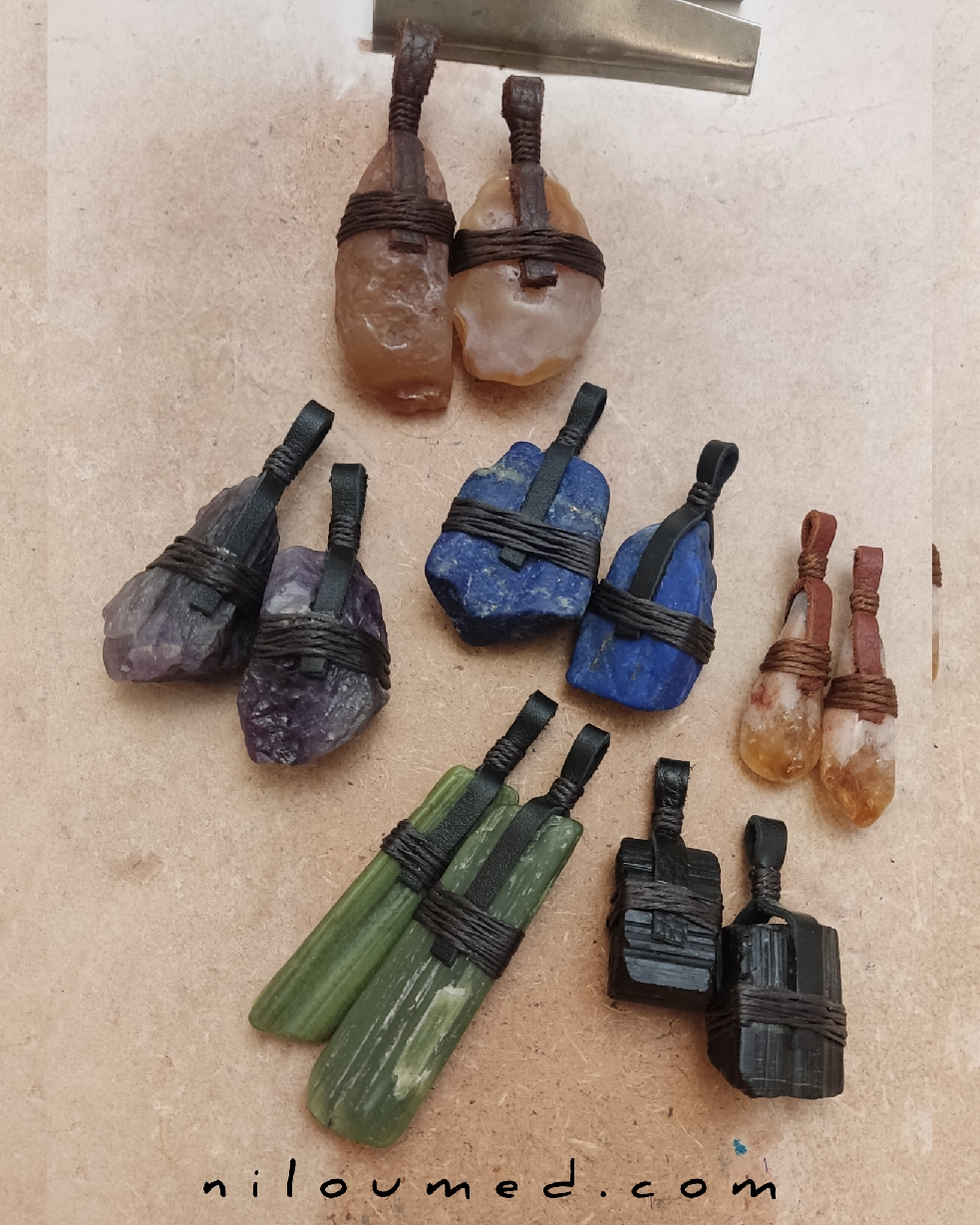گردنبندها دارای بند چرمی با گره سرخپوستی بوده و طول قابل تنظیم دارند
