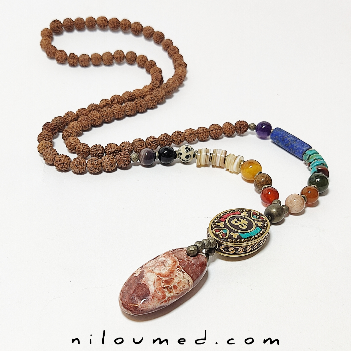 این گردنبند ترکیبی از دانه مقدس رودراکشا به همراه سنگهای طبیعی و مدال سنگ جاسپر گل آفتابگردان است