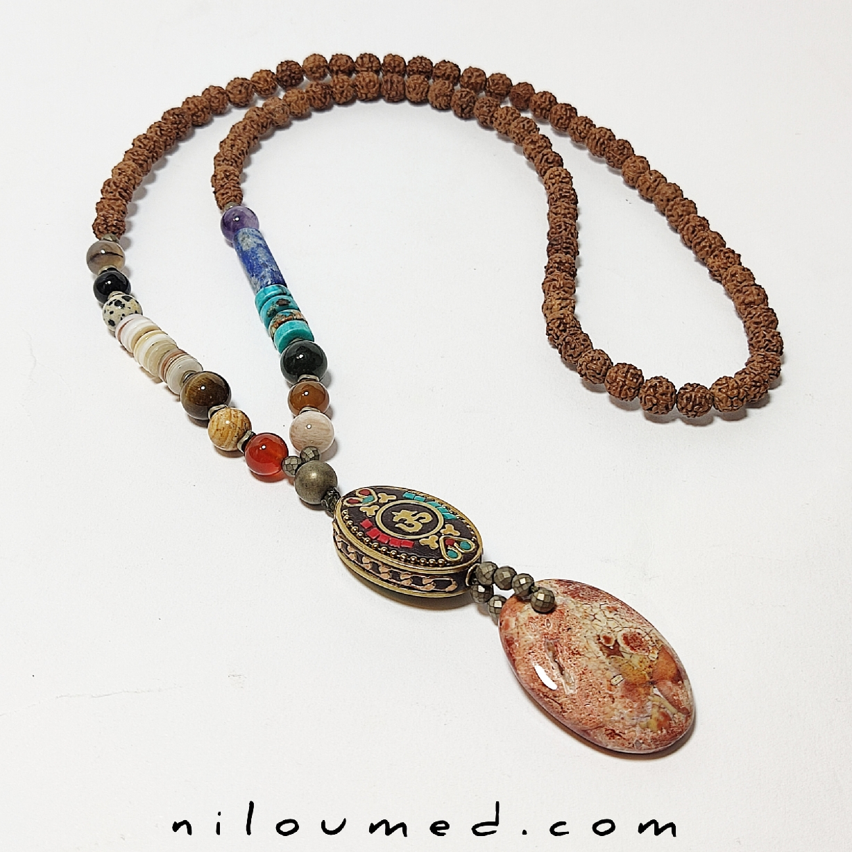 این گردنبند ترکیبی از دانه مقدس رودراکشا به همراه سنگهای طبیعی و مدال سنگ جاسپر گل آفتابگردان است